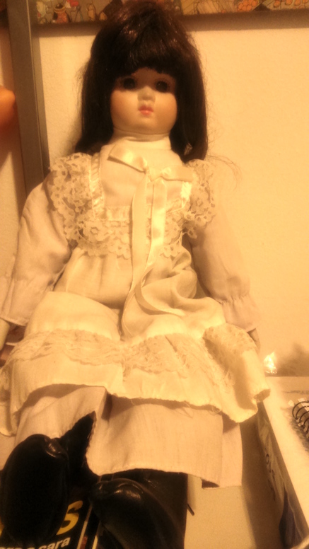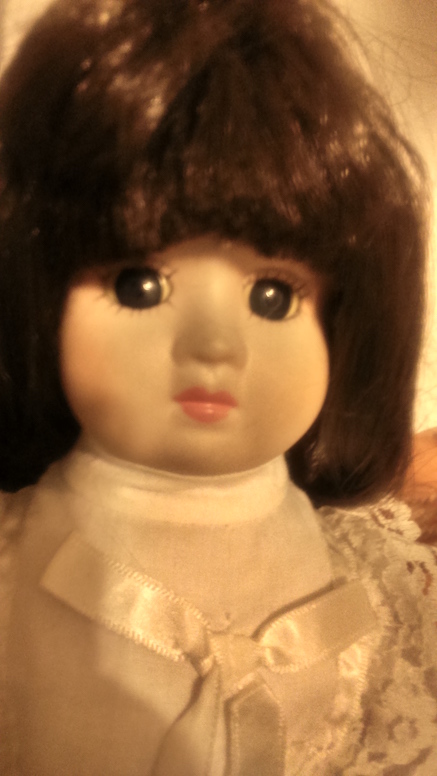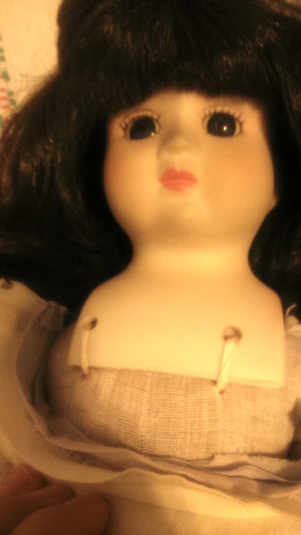 Esta muñeca, estaba entre un montón de muñecas de porcelana de estas coleccionables que últimamente están de saldo en todas partes. Esta es diferente a ellas por el aspecto de la cara, y el tipo de pelo además de la forma del cuerpo y la ropa y por eso me gustó. También me encantó el hecho de que su cabeza es un busco completo de los que va consido a la tela del cuerpo.